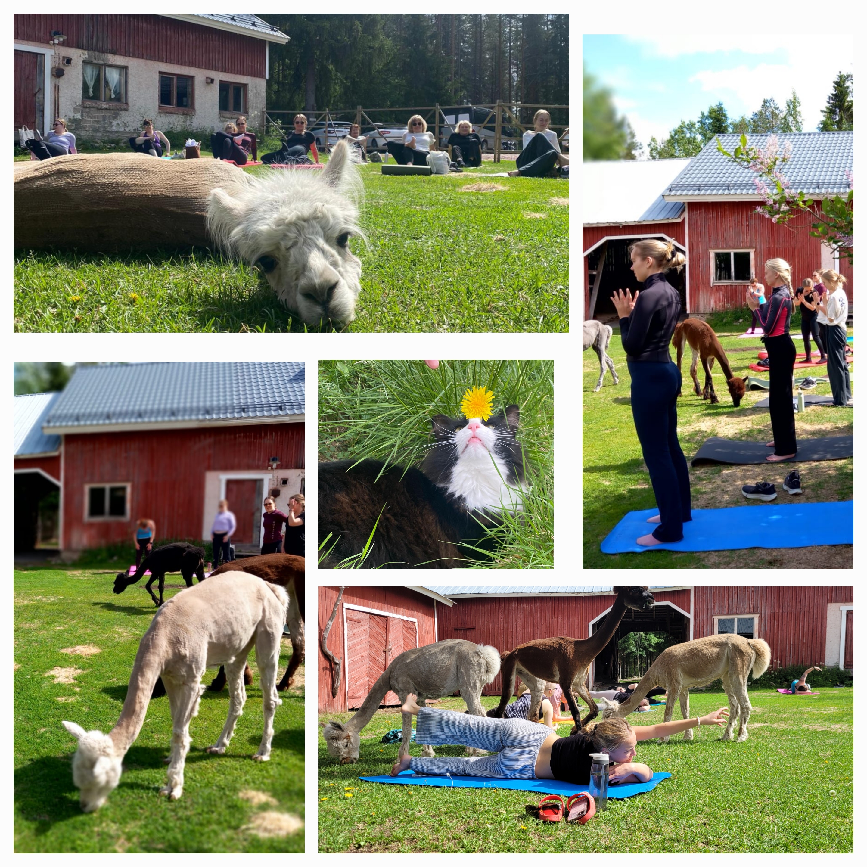Kesällä 2026 pidämme jälleen suosittua alpakkajoogaa Linnunradantilalla kolmena kesä sunnuntaina. Tapahtuman alussa tutustumme tilan toimintaan ja persoonallisiin alpakoihin. Jooga alkaa alpakoiden iloisesti rynnistäessä jooganurmikolle. Myös tilan kissat, kanat ja kukkko tepastelevat joogamattojemme välissä, joten pääset lähelle elämiä ja maadoittumaan aitoon maaseututunnelmaan.